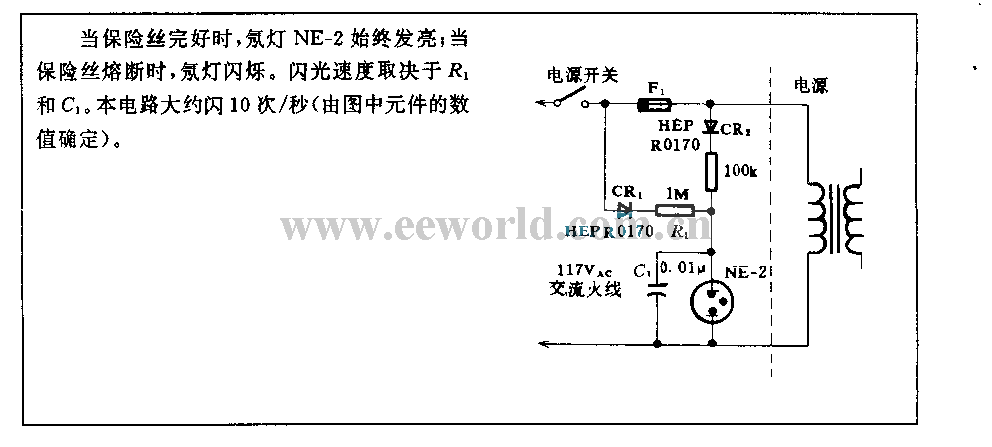 When fuse is unharmed, neon light NE-2 always shines; when fuse is blown, neon light flashes. Flash speed depends on R1 and C1. This circuit flashes 10 times/s ( it depens on numerical value of components in the diagram) .