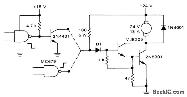 Circuit uses MJE205 5-A transistor in Darlington con-figuration driving 2N5301 30-A transistor for passing 18 A to DC motor under logic control.CMOS gate connections are shown for energizing motor when logic is low and when logic is high.-A. Pshaenich, Interface Techniques Between Industrial Logic and Power Devices, Motorola, Phoenix, AZ, 1975, AN-712A, p 19.