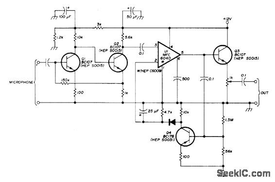 Uses Motorola MFC6040 voltage-controlled amplifierIC having 13-dB gain.and maximum of 90-dB gain reduction. Q1-Q2 form microphone preamp, Q4 is AGC detector/amplifier for IC, and a3 is output buffer. With 500-ohm dynamic microphone, output remains constant at 1.8 VRMS.-L. No-votny, Speech Compressor, Ham Radio, Feb.1976, p 70-71.