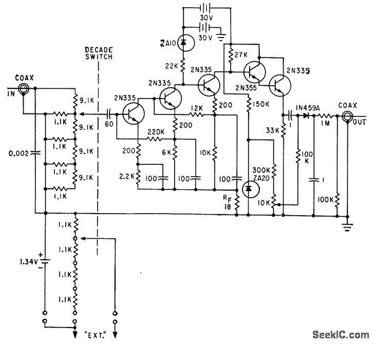 Decade amplifer of conventional phototransistor pyrometer control was modifed by removing output transformer and load inductor, lo give additional feed-back at low frequencies. Bootstrap emitter. follower stage was added as output buffer to improve circuit stability. Used for measuring high rocket surface temperatures.-S. A. Edler, Designing Phototransistor Pyrometers With and Without Feedback, Electronics, 34:49, p 56-60.
