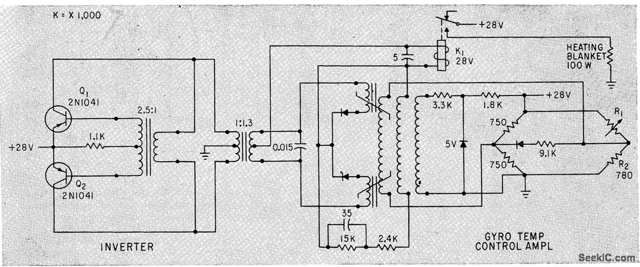 Regulates temperature to 0.5°F by sensing differences between gyro-mounted temperature-sensitive resistor R1 and fixed resistor R2 in bridge. Magnetic amplifier for bridge operates relay K1 to energize gyro heater when temperature is low, -R. E, King and H. Low, Solid-State Guidance For Able-Series Rockets, Electronics, 33:5, p 60-63.