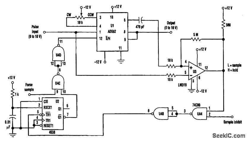 The input pulse is fed into the sample-and-hold amplifier (an inexpensive AD582), as well as the comparator U3. The SHA's output also is fed into the comparator. If the input pulse is higher in am-plitude than the SHA's output, the comparator output goes low and the 4538 one-shot produces a l0-ps pulse that is fed back to cause the SHA to sample and then hold the voltage. Subsequent input voltages that are less than the held value won't cause the one-shot to fire again.Gates U4A and U4B are used to inhibit the sampling when necessary. Gates U4C and U4D, at the one-shot's output, can force the AD 582 into the sample mode. This feature is useful to reset the output to zero by forcing a sample when the input to the AD582 is zero. The polarity of the peak-hold circuit can be easily changed from positive-to-negative peak hold by reversing the inputs of the comparator.