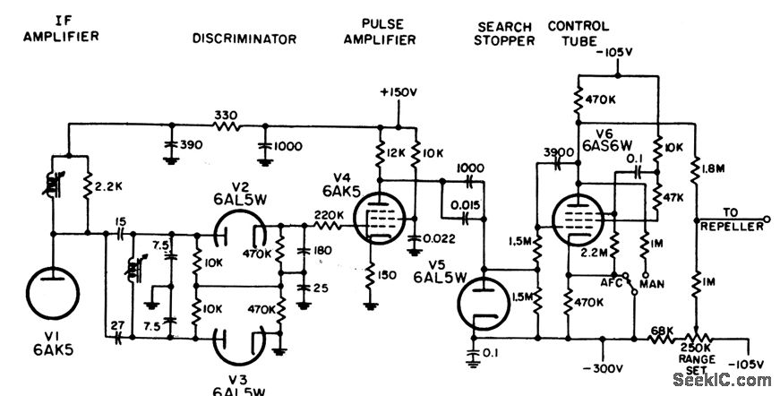 Pentode is astable phontastron during search and d-c amplifier during lock-on. Operation is nearly independent of tube characteristics. Provides tight control of local oscillator frequency because during lock-on, pentode furnishes direct control of klystron repeller.-NBS, Handbook Preferred Circuits Navy Aeronautical Electronic Equipment, Vol. 1, Electron tube Circuits, 1963, p N 13-6.