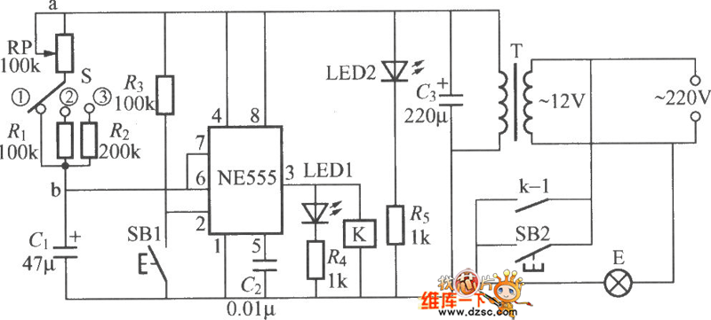 The darkroom exposure timer lamp circuit is as shown, the ne555 time base circuit and the potentiometer rp, capacitor c form the single-stable trigger. Usually the circuit is in reset state, pin-3 of ne555 send out the low-level current, relay K does not operate, exposure light E does not shine. LED led2 is designed as the indicator light, this indicator lightilluminates the dial of potentiometer rp. At this point the internal discharge of ne555 is conducted, capacitor C1 is shorted and can not be charged. k can be the small medium-power electromagnetic relay such as jzc-22f and dc12v.