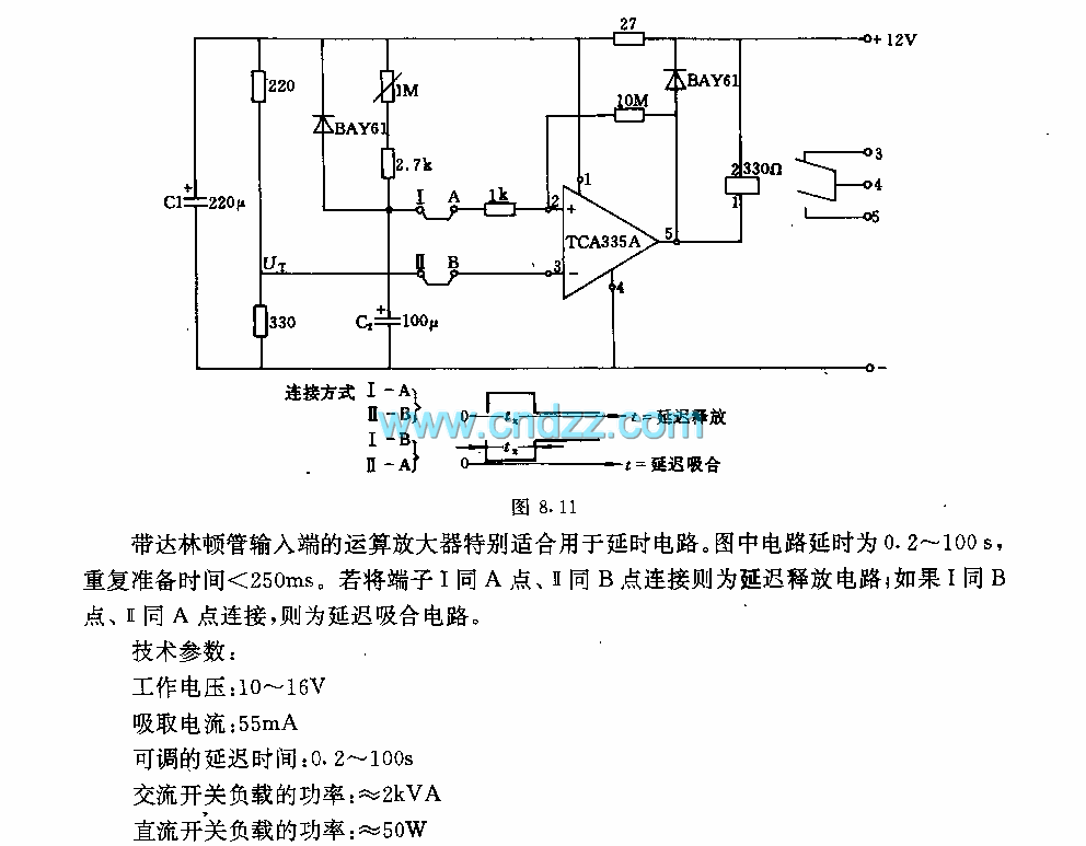 The operational amplifier of dainton tube input terminal is especially suitable for delay circuit. In figure, the circuit is 0.2~100s delay, repeat preparation time < 250ms. If the terminals 1 with A point, 2 with B connection, it is a delay circuit; If the terminals 1 withB point, 2 withA connection, it is a delay suck close circuit.