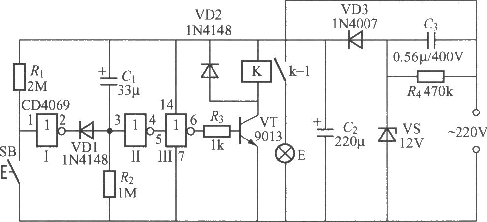 The figure is as shown, it is a delay light with digital IC, in figure, it only uses three good inverters of CD4069, the another three invertersare not used; connecting their input terminal to ground,it caneliminate the interferencewith circuit. K adopts JRX-22F、DC12V small middle power electromagnetic relay. The delay time is determined by the charge time constant of R2, C1.