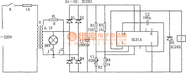 The figure shows the developer temperature control circuit. When the power supply is open, the temperature is low, the value of the R1 is high, so that the 5G31 outputs high level because the input potential of the positive end is higer than the input potential of the negative end.The relay J suck closes, RL starts to heat because the power supply is open and makes the temperature high. When the temperature rise to the control temperature, the bridge turns to balance. The 5G31 outputs low level because the potential of negative input terminal is higher than the positive input terminal . The relay J is disconnected, RL stops to heat because the power supply is closed.
