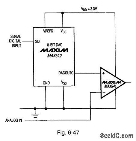 Figure 6-47 shows a MAX941 comparator combined with a MAX512 DAC to form a digitally controlled threshold detector. The analog signal to be compared is applied directly to the inverting input of the MAX941. The threshold point is set by the DAC output applied to the noninverting input. In turn, the DAC output is set by the serial digital input. As a result, the threshold can be set in eight discrete steps (depending on the serial input). MAXIM NEW RELEASES DATA BOOK, 1995, P. 3-69.