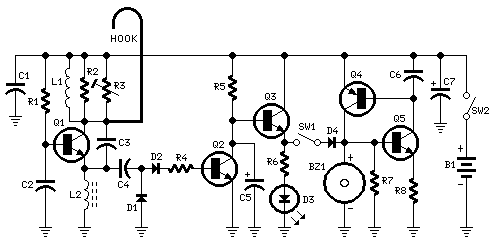 Parts:R1 1M 1/4W ResistorR2 3K3 1 or 2W Resistor (See Notes)R3 10K 1/2W Trimmer Cermet (See Notes)R4 33K 1/4W ResistorR5 150K 1/4W ResistorR6 2K2 1/4W ResistorR7 22K 1/4W ResistorR8 4K7 1/4W ResistorC1,C2 10nF 63V Ceramic or Polyester CapacitorsC3 10pF 63V Ceramic CapacitorC4,C6 100nF 63V Ceramic or Polyester CapacitorsC5 2µ2 25V Electrolytic CapacitorC7 100µF 25V Electrolytic CapacitorD1,D2,D4 1N4148 75V 150mA DiodesD3 5 or 3mm. Red LEDQ1,Q2,Q3,Q5 BC547 45V 100mA NPN TransistorsQ4 BC557 45V 100mA PNP TransistorL1 (See Notes)L2 10mH miniature InductorHook (See Notes)BZ1 Piezo sounder (incorporating 3KHz oscillator)SW1,SW2 SPST miniature Slider SwitchesB1 9V PP3 BatteryClip for PP3 Battery
