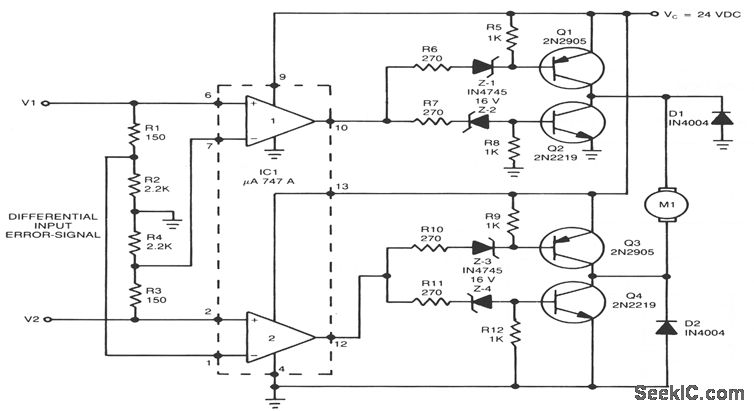 This high-performance switching controller for a low-power dc servo motor uses a symmetrical complementary-transistor bridge. The bridge acts as a reversing switch between the motor and a single-ended power supply. Since the transistors operate either fully on or completely off, except during a very short transition period, much less heat is dissipated than in linear-amplifier circuits. Damping is provided by the circuit's inherent dynamic braking. Since either maximum or zero voltage is applied to the motor, the dynamic response is faster than that of linear servo drives.