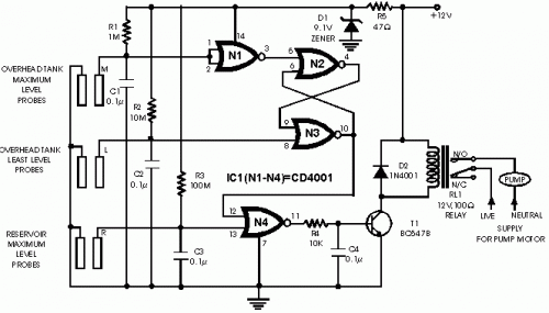 The automatic pump controller eliminates the need for any manual switching of pumps installed for the purpose of pumping water from a reservoir to an overhead tank (refer Fig. 1). It automatically switches on the pump when the water level in the tank falls below a certain low level (L), provided the water level in the reservoir is above a certain level (R). Subsequently, as the water level in the tank rises to an upper level (M), the pump switched off automatically. The pump is turned on again only when the water level again falls below level L in the tank, provided the level in the reservoir is above R. This automated action continues. The circuit is designed to ‘overlook’ the transient oscillations of the water level which would otherwise cause the logic to change its state rapidly and unnecessarily. The circuit uses a single CMOS chip (CD4001) for logic processing. No use of any moving electro-mechanical parts in the water-level sensor has been made. This ensures quick response, no wear and tear, and no mechanical failures. The circuit diagram is shown in Fig. 2. The device performed satisfactorily on a test run in conjunction with a 0.5 HP motor and pump. The sensors used in the circuit can be any two conducting probes, preferably resistant to electrolytic corrosion. For instance, in the simplest case, a properly sealed audio jack can be used to work as the sensor. The circuit can also be used as a constant fluid level maintainer. For this purpose the probes M and L are brought very close to each other to ensure that the fluid level is maintained within the M and L levels. The advantage of this system is that it can be used in tanks/reservoirs of any capacity whatsoever. However, the circuit cannot be used for purely non-conducting fluids. For non-conducting fluids, some modifications need to be made in the fluid-level sensors. The circuit can however be kept intact.