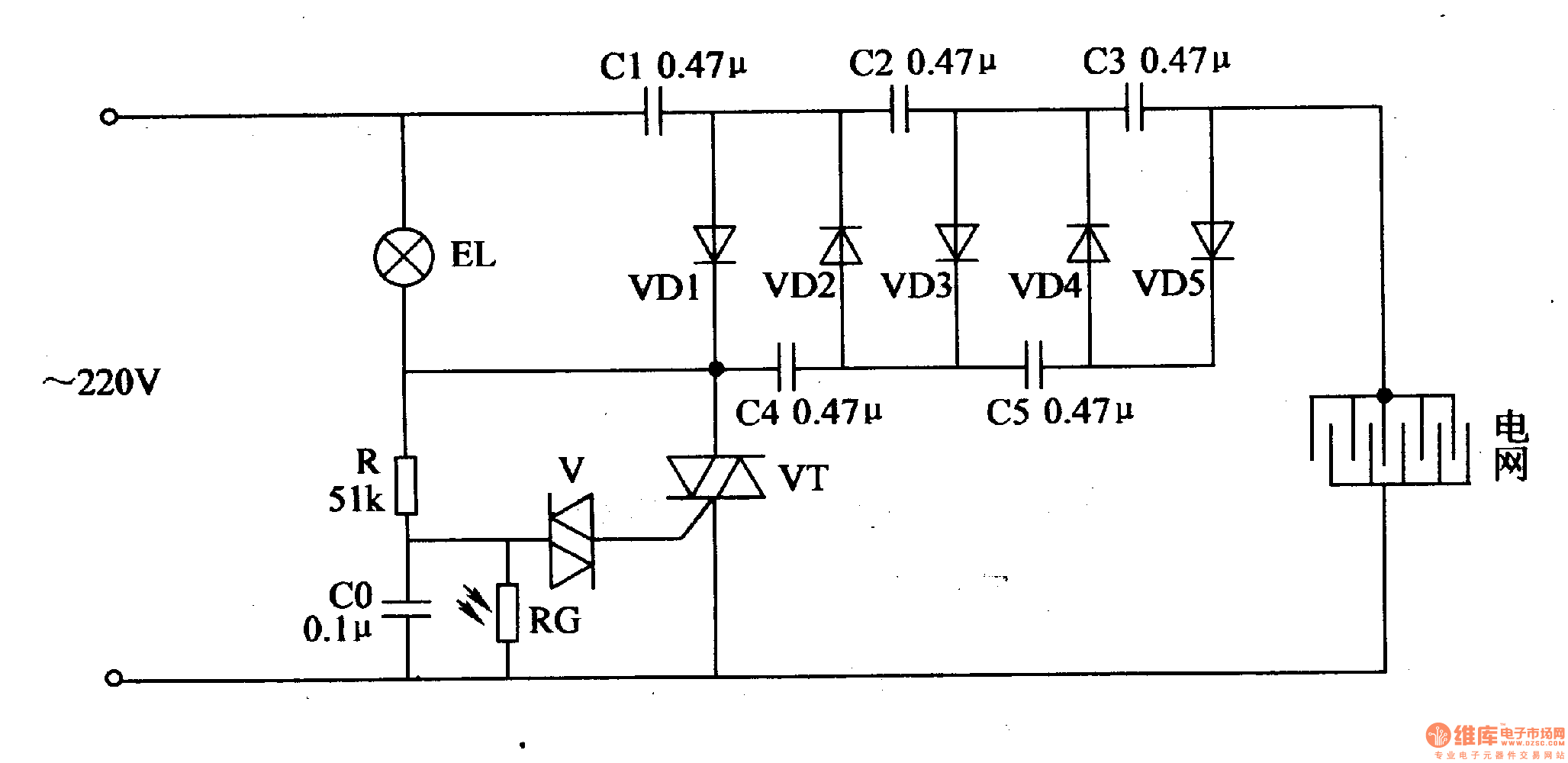 In the daytime, RG's resistance value is low, making CO circuit short. VT is disconnected because of lack of voltage, and the rectifying circuit doesn't work. When there is no light in the evening, RG has a large resistance value. R and CO begin to charge. When CO's voltage reaches a certain value, V and VT are connected. The rectifying circuit begins to work. The alternating current 220V voltage will generate 1450V high voltage, which will be put onto the electric net. When the pest touches the net, it will be killed by the high voltage.