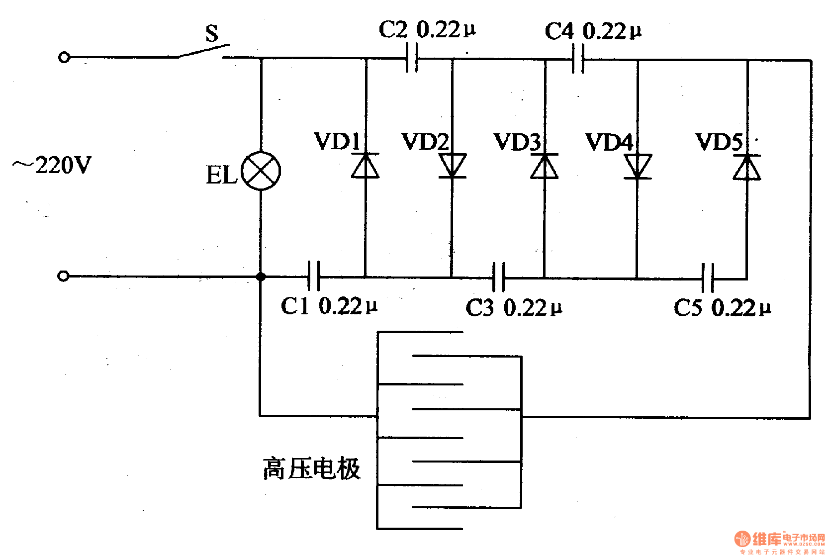 In the circuit, C1-C5 and VD1-VD5 make up a 5 times voltage rectification circuit.