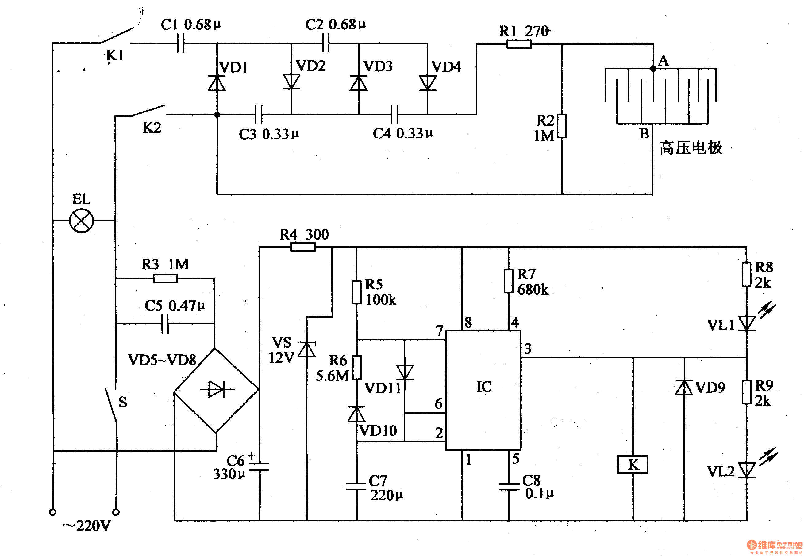 When IC begins to oscillate, its 3 pin will output low frequency pulse signal. When IC's 3 pin outputs high level, K is connected, V is illuminated and VL1 goes out.After 220V voltage is rectified, it will generate 1000V high voltage which will be put onto the high voltage electrode. When IC's 3 pin outputs low level, K is released, VL2 goes out, VL1 is illuminated. K's K1 and K2 are connected, and the high voltage generator stops working.