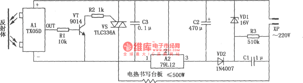 The electrothermal office desk plate automatic switch circuit is as shown in the figure, this device is composed of the ordinary electrothermal office desk plate and the infrared reflected type automatic switch which is composed of the TX05D, it has the automatic electricity heating function when someone is working on the desk, and also it has the function of automatic power off when no one is there. So it can save the electric energy, avoid the frequently plugfest, extend the service life of electrothermal office desk plate and prevent the accidents, it can be used on the ordinary electrothermal office desk plate, it is easy to make and very reliable.