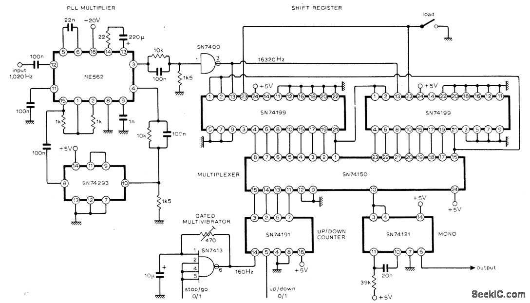 Circuit provides accurate phasing of 51-polpair phonic/synchronous motor in facsimile transmitter, and can readily be adapted for similar applications. A 16-stage shift register loaded with 1 bit and connected as ring counter is clocked at 16 times required drive motor frequency. This gives pulse train with 1:15 mark-space ratio and repetition rate equal to drive frequency. Multiplexer used as single-pole 16-way switch can select output for any stage of shift register; each clockwise switch step gives 360/16 or 22.5° phase advance. Article describes circuit operation in detail-P. E. Baylis and R. J. Brush, Synchronous-Motor Phase Control, Wireless World, April 1976, p 62.