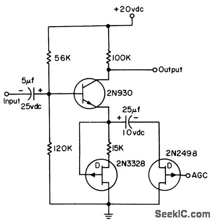 Uses 2N2498 fet as variable-emitter resistor in common-emitter transistor amplifier. Low-current 2N3328 is used to supply constant emitter bias current and have very light dynamic loading on emitter for maximum agc range. Since variable resistor is capacitor-coupled to emitter of transistor, there is no change in bias current when strong agc voltage is suddenly applied. Absence of transient thump makes circuit desirable for broadcast speech compressors.-L. J. Sevin, Jr., Field-Effect Transistors, McGraw-Hill, N.Y., 1965, p 78.
