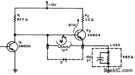 Bypassing of emitter-follower with inductor L cuts normal 70-nsec switching time to 38 nsec. Use of diode D across L improves rise time without affecting fall lime.-T. Asai, Forced-Switching Emitter Follower, EEE, 12:2, p 29.