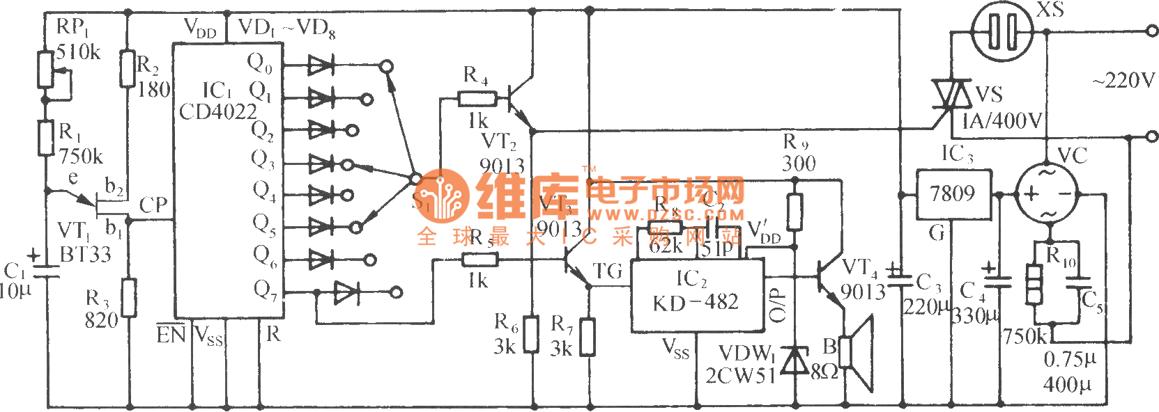 It is composed of relaxation oscillator, pulse counting frequency doubling circuit, SCR control socket circuit, music sound circuit and AC buck rectifier circuit and other components. When it issues the simulated natural wind, it is also accompanied by 12 international songs to give the joy of beauty. VT1 uses unijunction transistor BT33, and it forms form a relaxation oscillator with R1 ~ R3, C1, etc.
