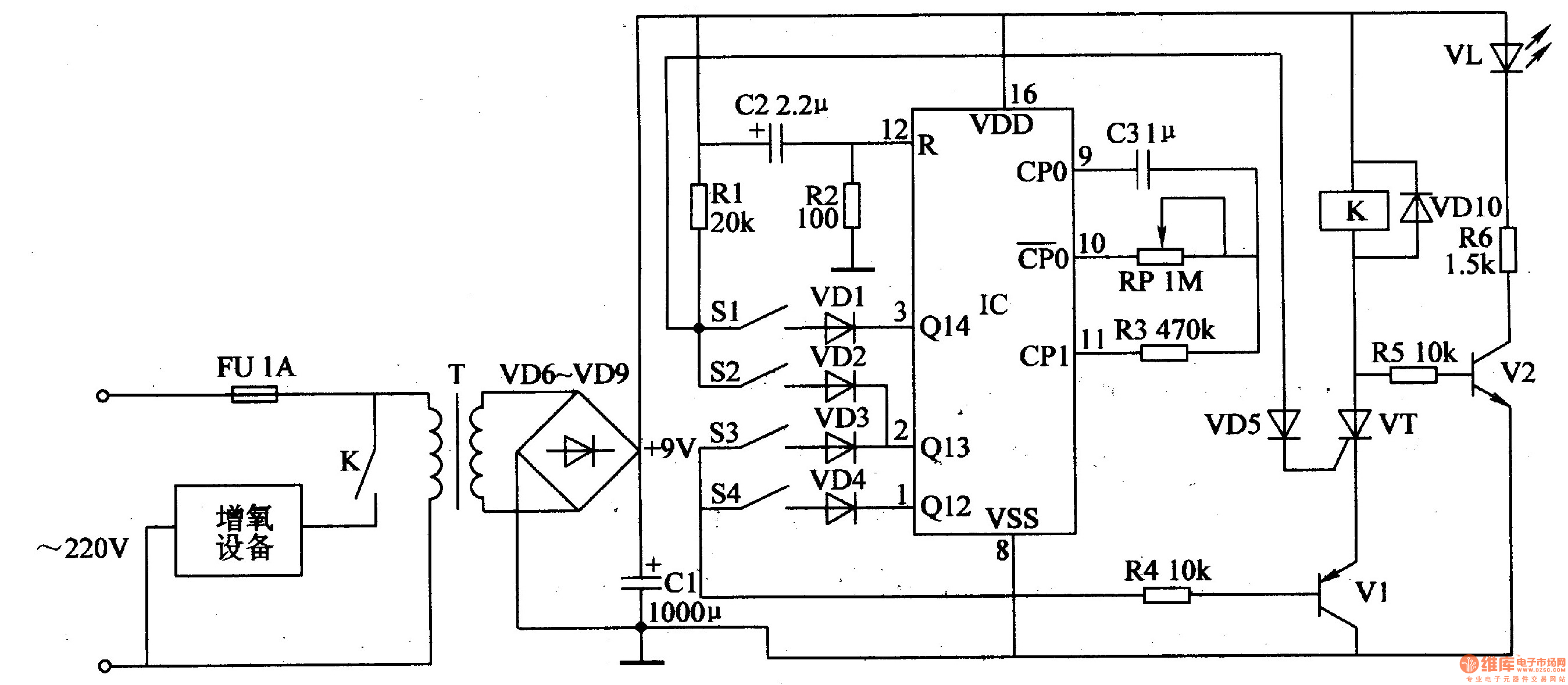 The fish farming oxygen increasing circuit is composed of the power supply circuit, timing control circuit and control implementation circuit and working status indication circuit, and it is shown in Figure 4-19. Power supply circuit consists of the fuse FU, power transformer T, rectifier diodes VD6-VDg and filter capacitor Cl. Timing controller circuit consists of the timer integrated circuit IC, resistors Rl-R3, potentiometer RP, capacitors C2, C3, diodes VDl-VD4 and control switches Sl-S4. Control implementation circuit consists of the resistor R4, transistor Vl, diodes VD5, VDlO, thyristor VT and the relay K.