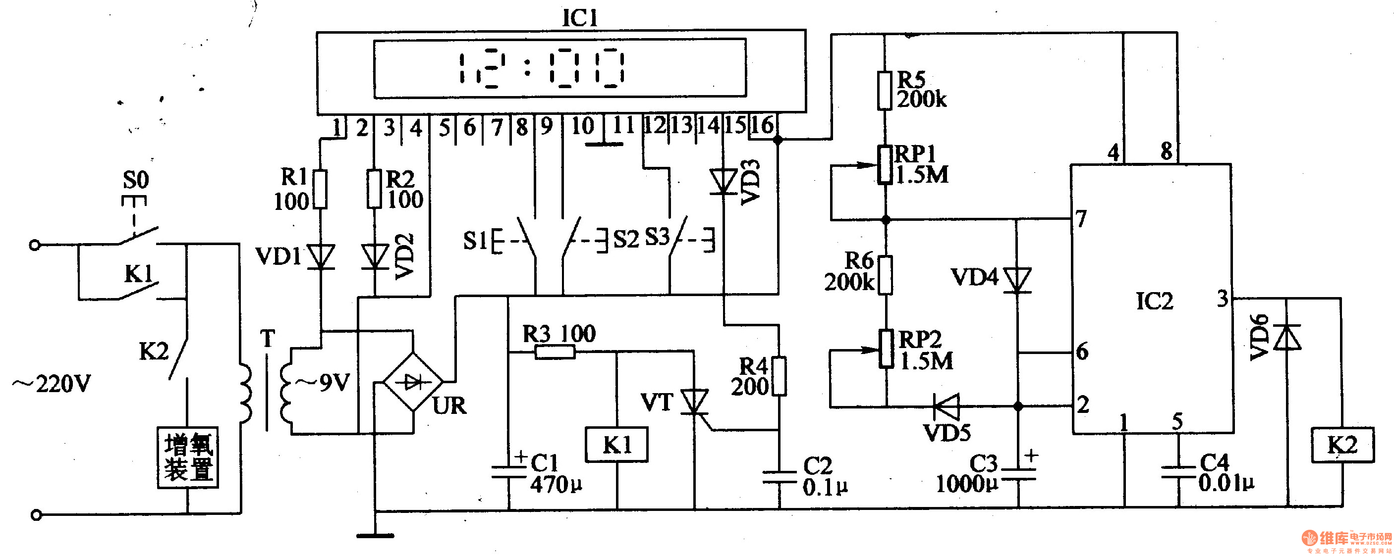 The fish farming oxygen increasing circuit is composed of the power supply circuit, clock-control timing circuit and intermittent control circuit, and it is shown in Figure 4-20. Power supply circuit consists of the power button S0, power transformer T, bridge rectifier UR and filter capacitor C1. Clock-control timing circuit is composed of clock-control board circuit ICl, resistors Rl-R4, diodes VDl-VD3, time set buttons S1-S3, SCR VT, relay Kl and capacitor C2. Intermittent control circuit is composed of the time-base integrated circuit IC2, resistors R5, R6, potentiometers RPl, RP2, capacitors C3, C4, diodes VD4-VD6 and relay K2.
