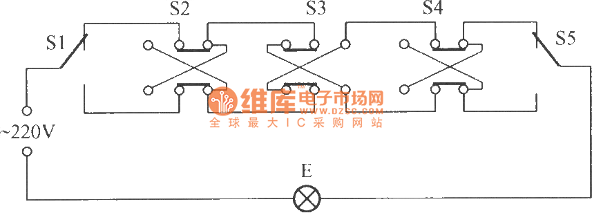 As the Figure shows, it isa five control switch circuit. S1 ~ S5 are respectively arranged in 5 different places, but they can independently control lamp E lit or extinguished. Among them: S1, S5 1 x 2 single-pole double-throw switch, S2 ~ S4 with 2 x 2 double pole double throw switch.