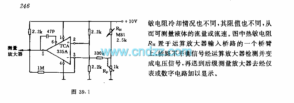This circuit uses thermistors for load to measure flow. For a certain liquid medium, when its velocity is not the same, thermistors' cooling conditions are different neither, so itcan measure the liquid flow quantityor flow rate. In diagram, thermistors RH is put on the the arm of amplifier input bridge road, Bridge road unbalanced signal is detected by amplifierand become voltages, then it issent to the latter stage measurement amplifier or digital circuit to display.