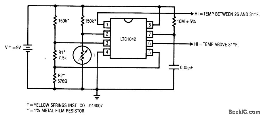 Fig. 13-30 This circuit shows a very simple configuration for a freezer alarm. Such circuits are used in industrial and home freezers as well as in refrigerated trucks and rail cars. The LTC1042 is a sampled-operation window comparator. The 10 MΩ/0.05μF combination sets a sample rate of 1 Hz, and the bridge values program the internal window comparator for the outputs shown. For normal freezer operation, pin 1 is high and pin 6 is low. Over-temperature reverses this state and can trigger an alarm. Circuit current consumption is about 80μA. Linear Technology, Linear Applications Handbook 1990, p. AN23-7.