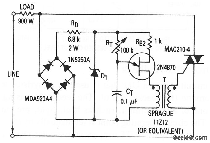 This circuit shows a UJT that is used as a full-wave trigger for a thyristor (a triac),which controls a 900-w load.