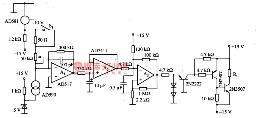 The furnace temperature control circuit which is composed of the AD590 is as shown in the figure. In this circuit, the output current of AD590 is compared with the benchmark current at the reverse phase input port of the Al, this current is decided by the -lOV stable voltage of the high performance voltage-regulator tube AD581; A2 is the filter; A3 is the addition calculator, it amplifies the error signal and adjusts the pulse width drive heater RL according to the temperature value. In order to get the most stable dynamic characteristics, we use the silicon grease to paste the AD590 on the heater RL. Due to the output current sensor AD590 is proportional to the temperature, we can adjust the film resistance of the chip, when the temperature is 298·2K(25℃), the output current is 298·2μA. So we can control the temperature of the furnace.