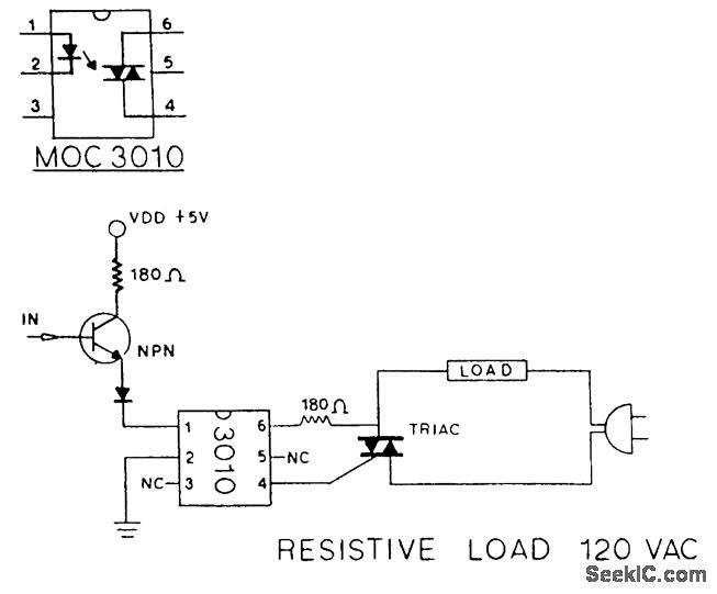 A TTL level input turns on the MOC3010 optocoupler and triggers the triac,applytng 120 Vac tothe load.