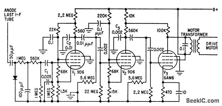 Portion of adf receiver output is separately rectified and applied to selective amplifier V1.V2-V3.C1, C2, and C3 develop 90° phase shift re quired between two coils of goniometer drive motor and serve also as low-pass fiber with sharp cutoff above 150 cps. Overall gain is high enough so motor will exert full torque when goniometer is only 3° off true null.-J. r. Hatch and D. W. G. Byatt, Direction Finder with Automatic Readout Electronics, 32:16, p 62-64.