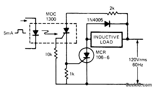 Simple AC relay operates during positive alternations of AC source, with optoisolator providing complete isolation between control circuit and SCR handling inductive load. When input LED is energized by control pulse, photo-SCR of optoisolator conducts and provides gate current for turning on power SCR. 1N4005 diode protects SCR from back EMF transients of inductive load.-T, Mazur, Solid-State Relays Offer New Solutions to Many Old Problems, EDN Magazine, Nov. 20, 1973, p 26-32.