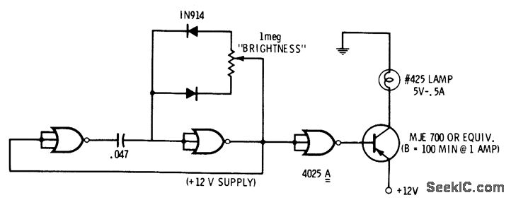 Provides lossless variation in brightness of incandescent lamp by using duty-cycle modulation. All three sections of 4025 triple three-input NOR gate turn lamp on and off rapidly at rate determined by setting of brightness control pot in astable MVBR circuit, Output transistor rating must be sufficient to handle lamp current.-D. Lancaster, CMOS Cookbook, Howard W. Sams, Indianapolig, IN, 1977,p 231.