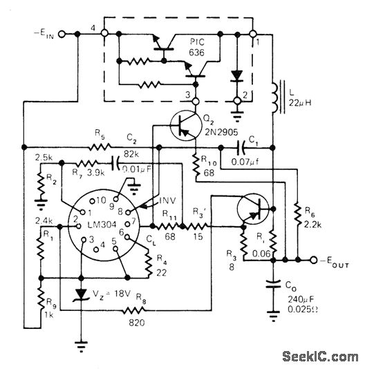 Uses zener to reduce supply voltage to acceptable level for LM304 IC regulator,Base drive and voltage isolation are provided by Q2, R10, and R11 for PIC636 hybrid power switch Circuit operates in fixed OFF-time mode, -L. Dixon and R. Patel, Designers' Guide to:Switching Regulators, EDN Magazine. Oct. 20, 1974, p 53-59.