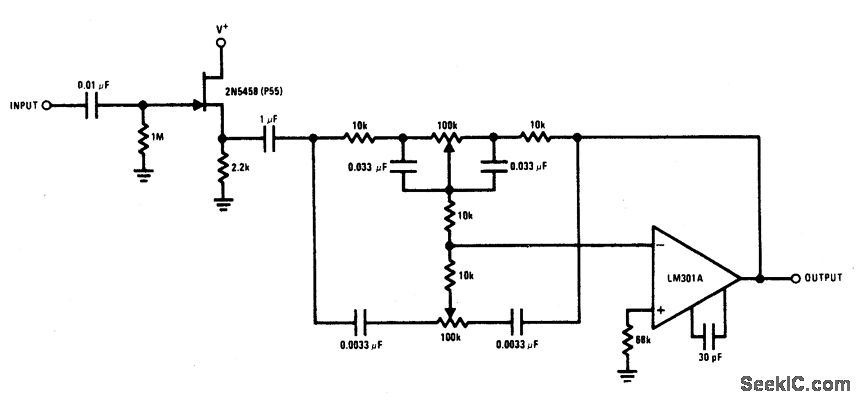 The 2N5458 JFET provides the function of a high input impedance and low noise characteristics to buffer an op amp feedback tone control circuit.