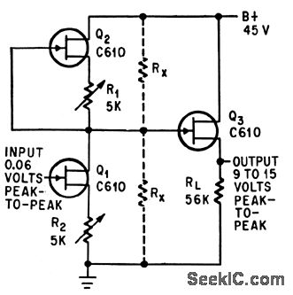 Three field-effect transistors give 45 db voltage gain for 1-cps riangular wave in horizontal defection circuit of crt.-F. J. Murphree and J. H. Hammond Jr., High-gain D.C Amplifier Drives CRT Display, Electronics, 37:19, p 53.
