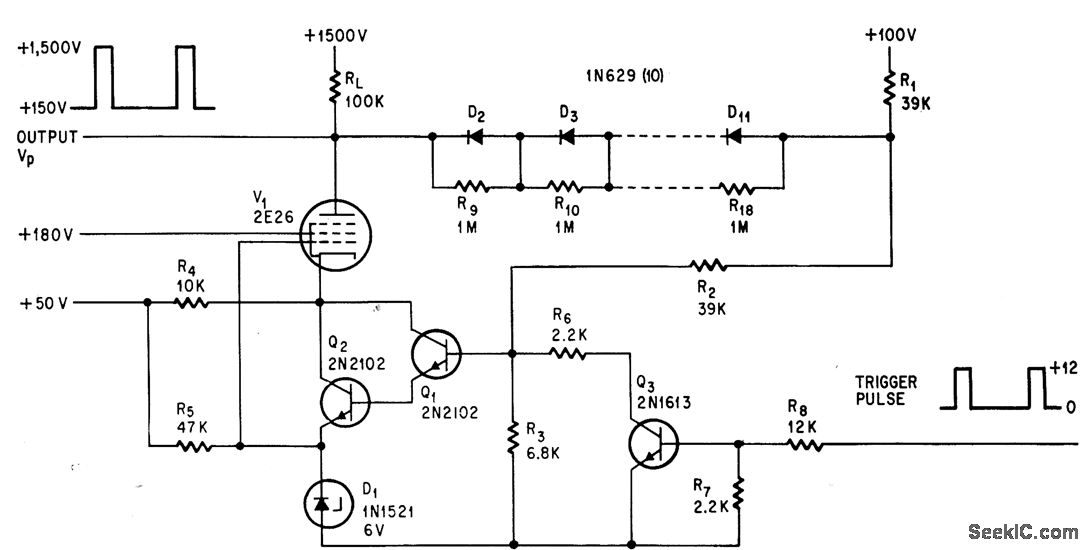 Trigger pulse at 12 V saturates Q3, voltage across R3 drops below level of tenor D1, and Q1 and Q2 turn off, making V1 stop conducting. Anode voltage of V1 then rises to 1,500-V supply value until input pulse is removed.-R. E. Thomas, 1,500-Volt Hybrid Switch has Low On Impedance, Electronics, 37:22, p 74-75.