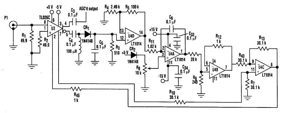 A simple IF AGC circuit that features wide dynamic range and excellent linearity can be achieved with two chips: Tl's TL026C voltage-controlled amplifier IC and Linear Technology's LT1014 (or any other similar basic quad op amp).