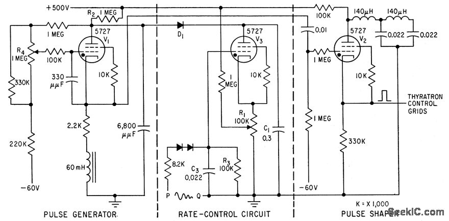 Thyratron n pulse generator V1 produces voltage pulses of adjustable frequency for pulse shaper V2, which drives hydrogen thyatrons of high-power induction heater. V3 regulates repetition rate of pulses by acting as switch that, when conducting, allows C1 to discharge rapidly through R1.-H. L. Van Der Horst, How Radar Techniques Improve Induction Heating, Electronics, 32:7, P 51-55.