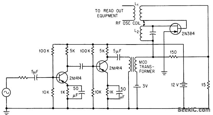 Transistors in modulated oscillator-transducer package withstand over 6,000 rpm on spin test while radiating measured data inductively from oscillator coils L1-L2 to stationary coil of readout equipment.-H. Baumann, Inductive Telemetry Improves Spin-System Measurements, Electronics, 36:46, p 41-42.