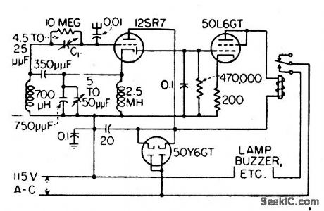Circuit stops oscillating when intruder approaches antenna surrounding area being protected. Uses weak oscillator with relay tube that is biased to cutoff by some of oscillator output. Additional capacitance caused by intruder stops oscillator, removing bias and making tube conduct and actuate relay to sound alarm.-J. Markus and V. Zeluft, Handbook of Industrial Electronic Control Circuits, McGraw-Hill, N.Y., 1956, p 19.