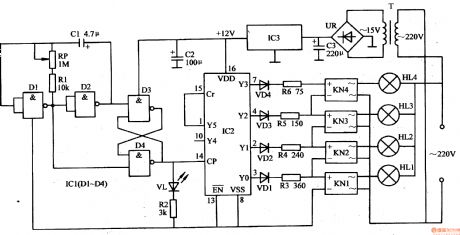 After the multivibrator begins to work, the oscillate pulse signal generated by it will be put on IC2's pin 14(CP terminal) after it is transformed by trigger RS. The signal will serve as IC2's count pulse. IC2's Y0-Y5 terminals will output high level in turn under the control of count pulse. Then KN1-KN4 will begin to work in turn, which will make HL1-HL4 illuminated in turn.