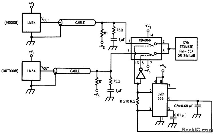 Pig. 13-10 The indoor and outdoor LM34 outputs are multiplexed through a CD4066 quad bilateral switch and then displayed (one at a time) on a DVM such as Texmate's PM-35X. Temperature range is -50° to +300°F. The LMC555 timer is run as an astable MV at 0.2 Hz so that each temperature is displayed for about 2.5 s. The RC filters at the LM34 outputs compensate for the capacitive loading of the cable. Notice that R1 must be selected to provide 50μA with the available -U supply (see Fig. 13-3). An LMC7660 can be used to provide -VS. National Semiconductor, Linear Applications Handbook, 1991, p. 1078.