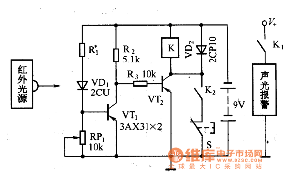 The infrared ray alarm circuit is as shown in the figure. It is composed of the light source, the receiver and the sound and light alarm circuit. There is the infrared receiver in a certain distance from the infrared light source, so there is an invisible infrared cordon between the infrared light source and the receiver.