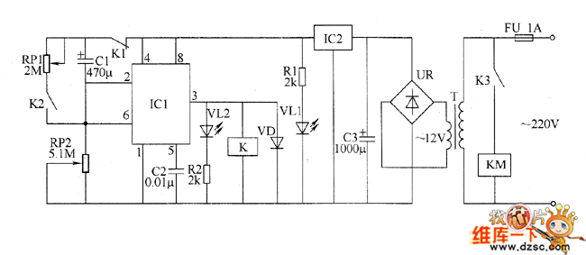 The intermittent controller circuit is composed of the power supply circuit, timing control circuit and control implementation circuit, and it is shown as the chart. Power supply circuit is composed of the fuse FU, power transformer T, bridge rectifier UR, filter capacitor C3, three-terminal voltage regulator integrated circuit IC2, current limiting resistor R1 and the power indicator LED VL1. Timing control circuit consists of the time-base integrated circuit IC1, potentiometers RP1 and RP2, resistor R2, working indication LED VL2 and capacitors C1, C2. Control implementation circuit consists of the relay K, AC contactor KM and diode VD.