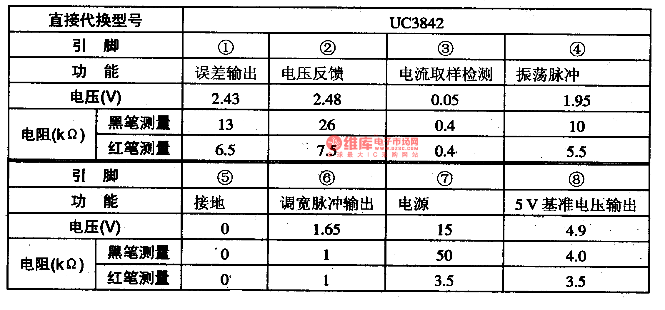 KA3842 integrated circuit adopts 8-foot dual in-line package, the integrated circuit's pin function and data are as shown in chart 1-1.