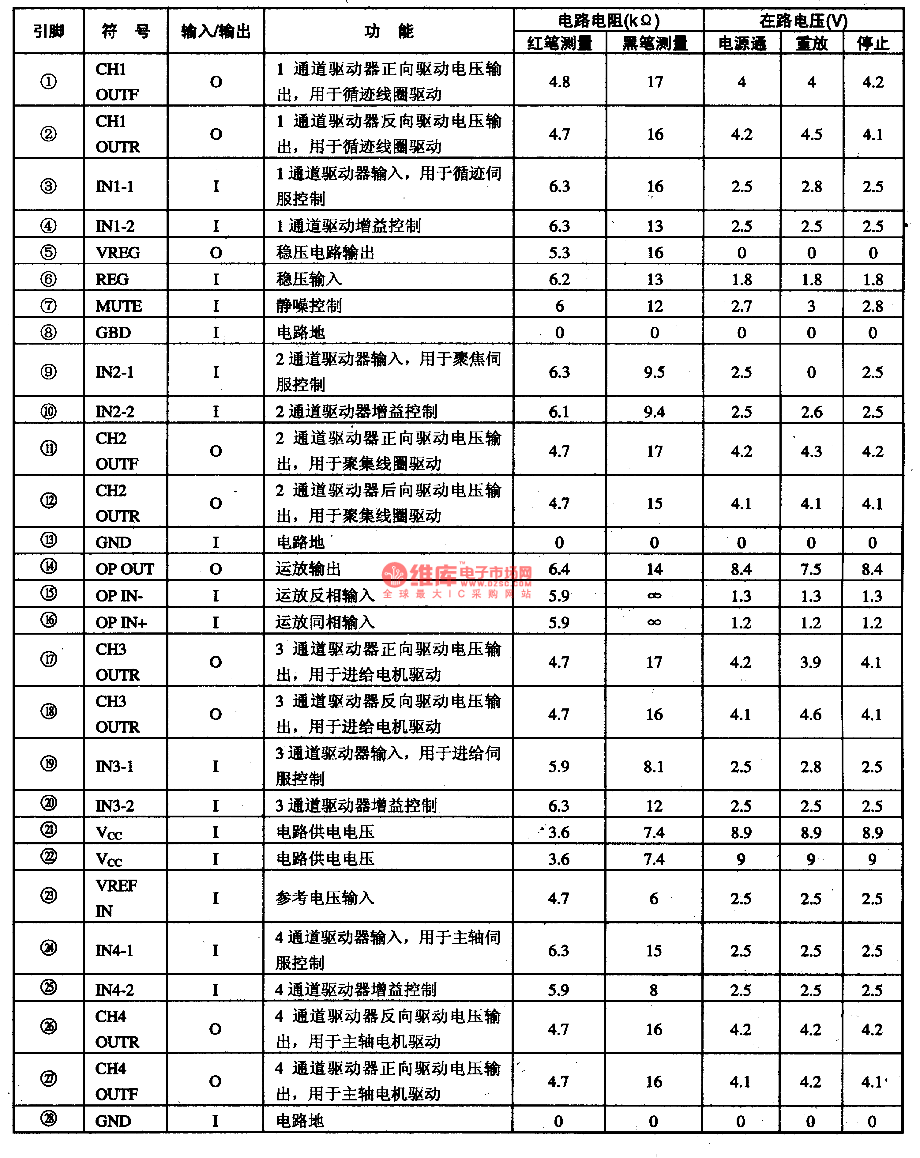 KA9258D integrated circuit adopts 28-foot dual line flat type packing structure, the pin function and data of this integrated circuit is shown in chart1-1. This data is measured in VCD一21O VCD player.