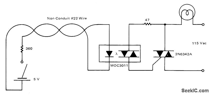 Motorola M0C3011 optoisolator permits control of large lamp,motor, pool pump, and other AC loads from remote location with low-voltage signal wiring while meeting building codes. Choice of triac depends on load being handled.-P.O'Neil, Applications of the MOC3011 Triac Driver, Motorola, Phoenix, AZ, 1978, AN-780, p 5.