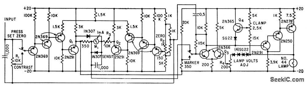 Count-rate meter of radiation-detecting tumor stunner provides input signal for d-c amplifier. Controls R1 and R2in difference amplifier provides zero suppression and R3 provides scale expansion. Circuit drives lamp that exposes film in step with scanning motion of probe.-E. Gordy and G. Sieber, Sensitive Amplifier Helps Lo-Gale Tumors, Electronics, 34:1, p 123-124.